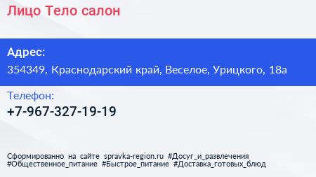 Лицо & Тело, салон по адресу 354349, Краснодарский край, Веселое, Урицкого, 18а в дальнейшем Организация, размещена в следующих категориях: