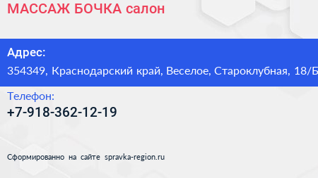 МАССАЖ & БОЧКА, салон по адресу 354349, Краснодарский край, Веселое, Староклубная, 18/Б в дальнейшем Организация, размещена в следующих категориях: