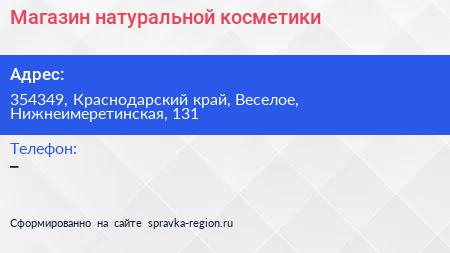 Магазин натуральной косметики по адресу 354349, Краснодарский край, Веселое, Нижнеимеретинская, 131 в дальнейшем Организация, размещена в следующих категориях:
