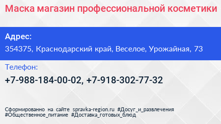 Маска, магазин профессиональной косметики по адресу 354375, Краснодарский край, Веселое, Урожайная, 73 в дальнейшем Организация, размещена в следующих категориях: