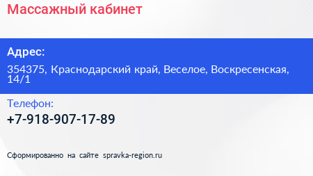 Массажный кабинет по адресу 354375, Краснодарский край, Веселое, Воскресенская, 14/1 в дальнейшем Организация, размещена в следующих категориях: