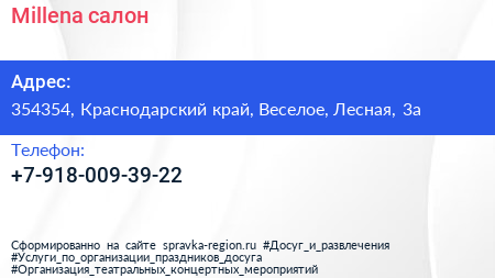 Millena, салон по адресу 354354, Краснодарский край, Веселое, Лесная, 3а в дальнейшем Организация, размещена в следующих категориях:
