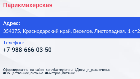 Парикмахерская по адресу 354375, Краснодарский край, Веселое, Листопадная, 1 ст2 в дальнейшем Организация, размещена в следующих категориях: