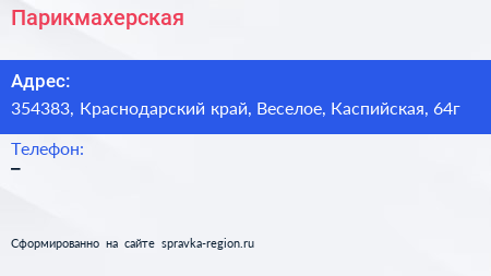 Парикмахерская по адресу 354383, Краснодарский край, Веселое, Каспийская, 64г в дальнейшем Организация, размещена в следующих категориях: