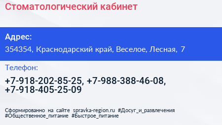 Стоматологический кабинет по адресу 354354, Краснодарский край, Веселое, Лесная, 7 в дальнейшем Организация, размещена в следующих категориях: