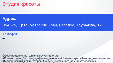 Студия красоты по адресу 354375, Краснодарский край, Веселое, Трубачёва, 17 в дальнейшем Организация, размещена в следующих категориях: