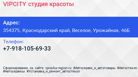 VIPCITY, студия красоты по адресу 354375, Краснодарский край, Веселое, Урожайная, 46Б в дальнейшем Организация, размещена в следующих категориях: