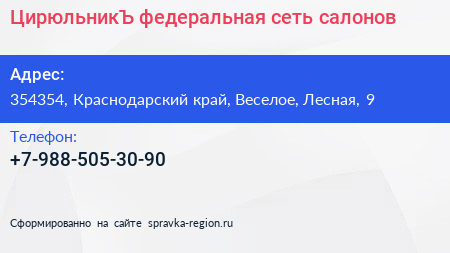 ЦирюльникЪ, федеральная сеть салонов по адресу 354354, Краснодарский край, Веселое, Лесная, 9 в дальнейшем Организация, размещена в следующих категориях: