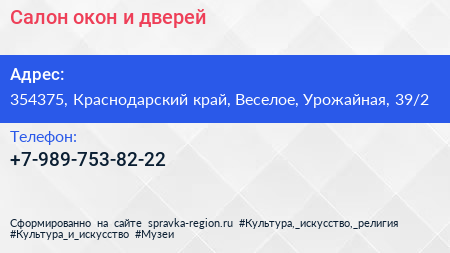 Салон окон и дверей по адресу 354375, Краснодарский край, Веселое, Урожайная, 39/2 в дальнейшем Организация, размещена в следующих категориях: