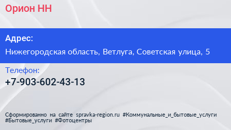 Орион НН по адресу Нижегородская область, Ветлуга, Советская улица, 5 в дальнейшем Организация, размещена в следующих категориях: