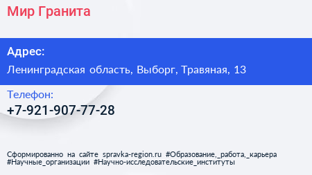 Мир Гранита по адресу Ленинградская область, Выборг, Травяная, 13 в дальнейшем Организация, размещена в следующих категориях: