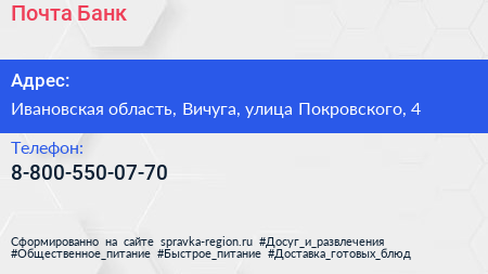 Почта Банк по адресу Ивановская область, Вичуга, улица Покровского, 4 в дальнейшем Организация, размещена в следующих категориях:
