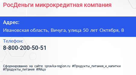РосДеньги, микрокредитная компания по адресу Ивановская область, Вичуга, улица 50 лет Октября, 8 в дальнейшем Организация, размещена в следующих категориях: