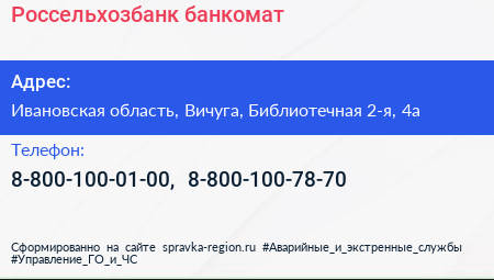 Россельхозбанк, банкомат по адресу Ивановская область, Вичуга, Библиотечная 2-я, 4а в дальнейшем Организация, размещена в следующих категориях: