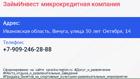 ЗаймИнвест, микрокредитная компания по адресу Ивановская область, Вичуга, улица 50 лет Октября, 14 в дальнейшем Организация, размещена в следующих категориях: