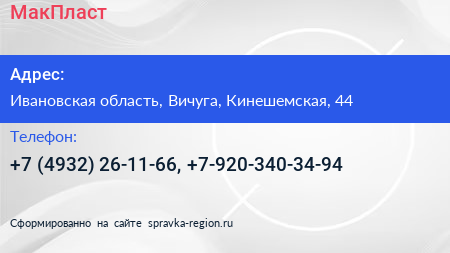 МакПласт по адресу Ивановская область, Вичуга, Кинешемская, 44 в дальнейшем Организация, размещена в следующих категориях: