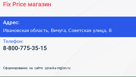 Fix Price, магазин по адресу Ивановская область, Вичуга, Советская улица, 8 в дальнейшем Организация, размещена в следующих категориях: