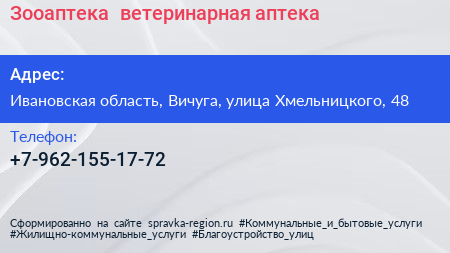 Зооаптека+, ветеринарная аптека по адресу Ивановская область, Вичуга, улица Хмельницкого, 48 в дальнейшем Организация, размещена в следующих категориях: