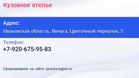 Кузовное ателье по адресу Ивановская область, Вичуга, Цветочный переулок, 5 в дальнейшем Организация, размещена в следующих категориях: