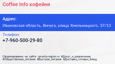 Coffee.Info, кофейня по адресу Ивановская область, Вичуга, улица Хмельницкого, 37/13 в дальнейшем Организация, размещена в следующих категориях: