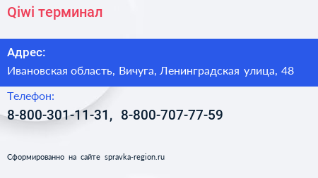 Qiwi, терминал по адресу Ивановская область, Вичуга, Ленинградская улица, 48 в дальнейшем Организация, размещена в следующих категориях: