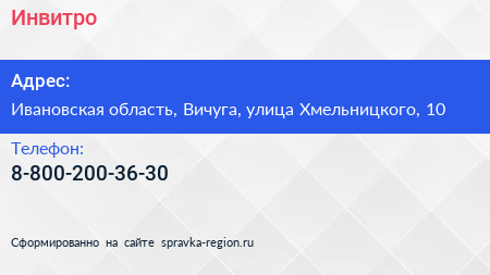 Инвитро по адресу Ивановская область, Вичуга, улица Хмельницкого, 10 в дальнейшем Организация, размещена в следующих категориях: