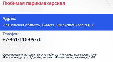 Любимая, парикмахерская по адресу Ивановская область, Вичуга, Филиппёнковская, 6 в дальнейшем Организация, размещена в следующих категориях: