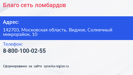 Благо, сеть ломбардов по адресу 142703, Московская область, Видное, Солнечный микрорайон, 10 в дальнейшем Организация, размещена в следующих категориях:
