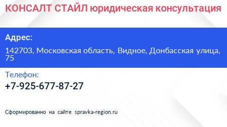 КОНСАЛТ СТАЙЛ, юридическая консультация по адресу 142703, Московская область, Видное, Донбасская улица, 75 в дальнейшем Организация, размещена в следующих категориях: