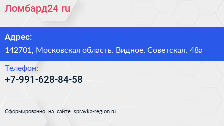 Ломбард24.ru по адресу 142701, Московская область, Видное, Советская, 48а в дальнейшем Организация, размещена в следующих категориях: