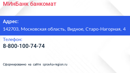 МИнБанк, банкомат по адресу 142703, Московская область, Видное, Старо-Нагорная, 4 в дальнейшем Организация, размещена в следующих категориях: