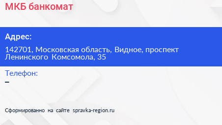 МКБ, банкомат по адресу 142701, Московская область, Видное, проспект Ленинского Комсомола, 35 в дальнейшем Организация, размещена в следующих категориях:
