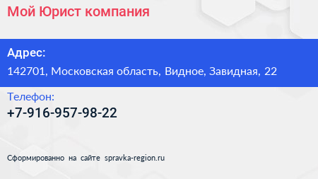 Мой Юрист, компания по адресу 142701, Московская область, Видное, Завидная, 22 в дальнейшем Организация, размещена в следующих категориях: