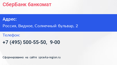 СберБанк, банкомат по адресу 2, Солнечный бульвар, Жилой комплекс «Государев дом», Лопатино, Ленинский городской округ, Московская область, Центральный федеральный округ, 142710, Россия в дальнейшем Организация, размещена в следующих категориях: