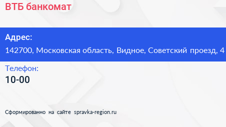 ВТБ, банкомат по адресу 142700, Московская область, Видное, Советский проезд, 4 в дальнейшем Организация, размещена в следующих категориях: