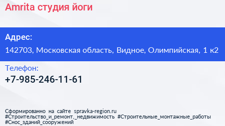 Amrita, студия йоги по адресу 142703, Московская область, Видное, Олимпийская, 1 к2 в дальнейшем Организация, размещена в следующих категориях: