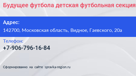 Будущее футбола, детская футбольная секция по адресу 142700, Московская область, Видное, Гаевского, 20а в дальнейшем Организация, размещена в следующих категориях: