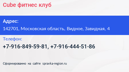 Cube, фитнес-клуб по адресу 142701, Московская область, Видное, Завидная, 4 в дальнейшем Организация, размещена в следующих категориях: