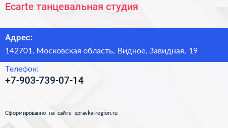 Ecarte, танцевальная студия по адресу 142701, Московская область, Видное, Завидная, 19 в дальнейшем Организация, размещена в следующих категориях: