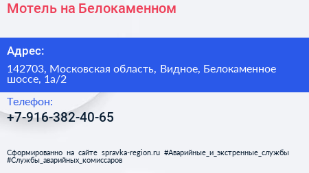 Мотель на Белокаменном по адресу 142703, Московская область, Видное, Белокаменное шоссе, 1а/2 в дальнейшем Организация, размещена в следующих категориях: