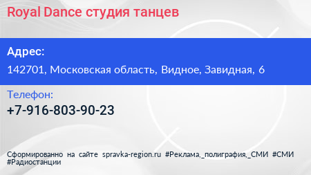 Royal Dance, студия танцев по адресу 142701, Московская область, Видное, Завидная, 6 в дальнейшем Организация, размещена в следующих категориях: