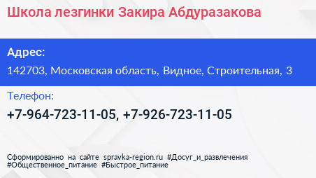 Школа лезгинки Закира Абдуразакова по адресу 142703, Московская область, Видное, Строительная, 3 в дальнейшем Организация, размещена в следующих категориях: