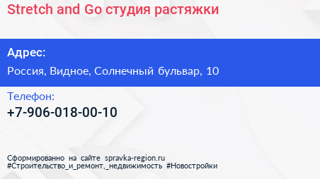 Stretch and Go, студия растяжки по адресу Ароматный мир, 10, Солнечный бульвар, Жилой комплекс «Государев дом», Лопатино, Ленинский городской округ, Московская область, Центральный федеральный округ, 142710, Россия в дальнейшем Организация, размещена в следующих категориях: