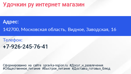 Удочкин.ру, интернет-магазин по адресу 142700, Московская область, Видное, Заводская, 16 в дальнейшем Организация, размещена в следующих категориях: