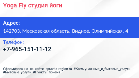 Yoga+Fly, студия йоги по адресу 142703, Московская область, Видное, Олимпийская, 4 в дальнейшем Организация, размещена в следующих категориях: