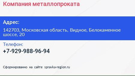 Компания металлопроката по адресу 142703, Московская область, Видное, Белокаменное шоссе, 20 в дальнейшем Организация, размещена в следующих категориях: