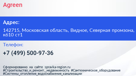 Agreen по адресу 142715, Московская область, Видное, Северная промзона, к610 ст1 в дальнейшем Организация, размещена в следующих категориях: