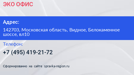 ЭКО-ОФИС по адресу 142703, Московская область, Видное, Белокаменное шоссе, вл10 в дальнейшем Организация, размещена в следующих категориях: