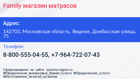 Family, магазин матрасов по адресу 142703, Московская область, Видное, Донбасская улица, 75 в дальнейшем Организация, размещена в следующих категориях: