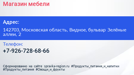 Магазин мебели по адресу 142703, Московская область, Видное, бульвар Зелёные аллеи, 2 в дальнейшем Организация, размещена в следующих категориях: